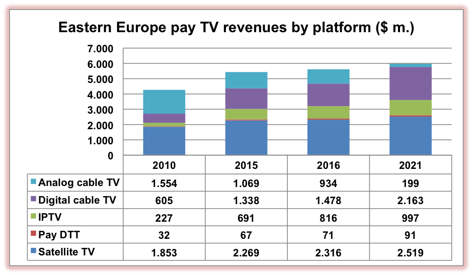 Despite the subscriber count increasing by fewer than one million, Eastern European pay-TV revenues will increase by 9.9% between 2015 and 2021 to $5.97 billion, according to the sixth edition of the Digital TV Eastern Europe Forecasts report.